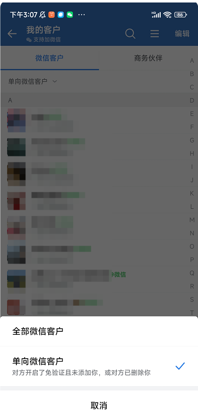 在「通訊錄」-「我的客戶」就能看到單向微信客戶,在編輯里就能批量刪除單向客戶。