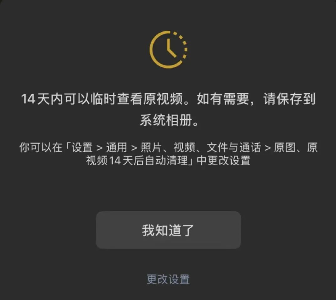 同時(shí)面對(duì)微信群里發(fā)送的圖片視頻,若我們沒(méi)有點(diǎn)擊查看過(guò)原圖、原視頻,微信在14天后依舊會(huì)清理掉,僅保留一個(gè)模糊縮略圖,點(diǎn)擊會(huì)提示「已過(guò)期或已被清理」