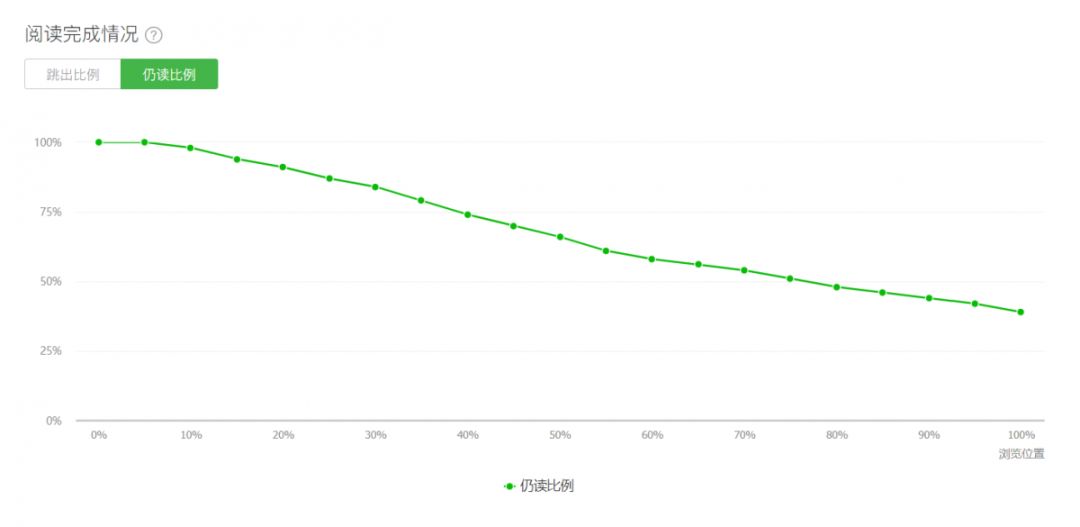 『仍讀人數(shù)』是指滑動(dòng)到該位置時(shí),還繼續(xù)閱讀的人數(shù)。計(jì)算方法為:仍讀比例 = 仍讀人數(shù) / 閱讀該圖文的總?cè)藬?shù)。