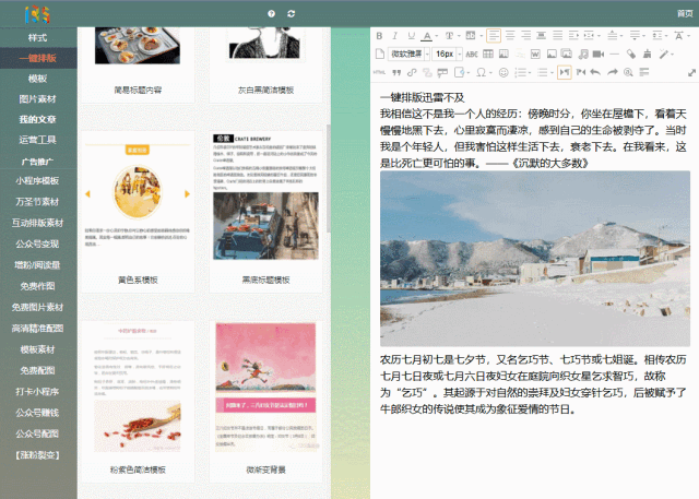 功能描述:作為最早的微信圖文排版工具,135編輯器具有:10萬(wàn)+樣式、多類型的全文模板、全面的基礎(chǔ)功能、DIY樣式、關(guān)鍵詞搜索、樣式轉(zhuǎn)圖片、一鍵排版、動(dòng)態(tài)彈幕、云端草稿等功能,這里聚集了500萬(wàn)新媒體人,從排版到漲粉,還有社群運(yùn)營(yíng)、在線課程等等服務(wù),滿足自媒體人90%的運(yùn)營(yíng)需求。