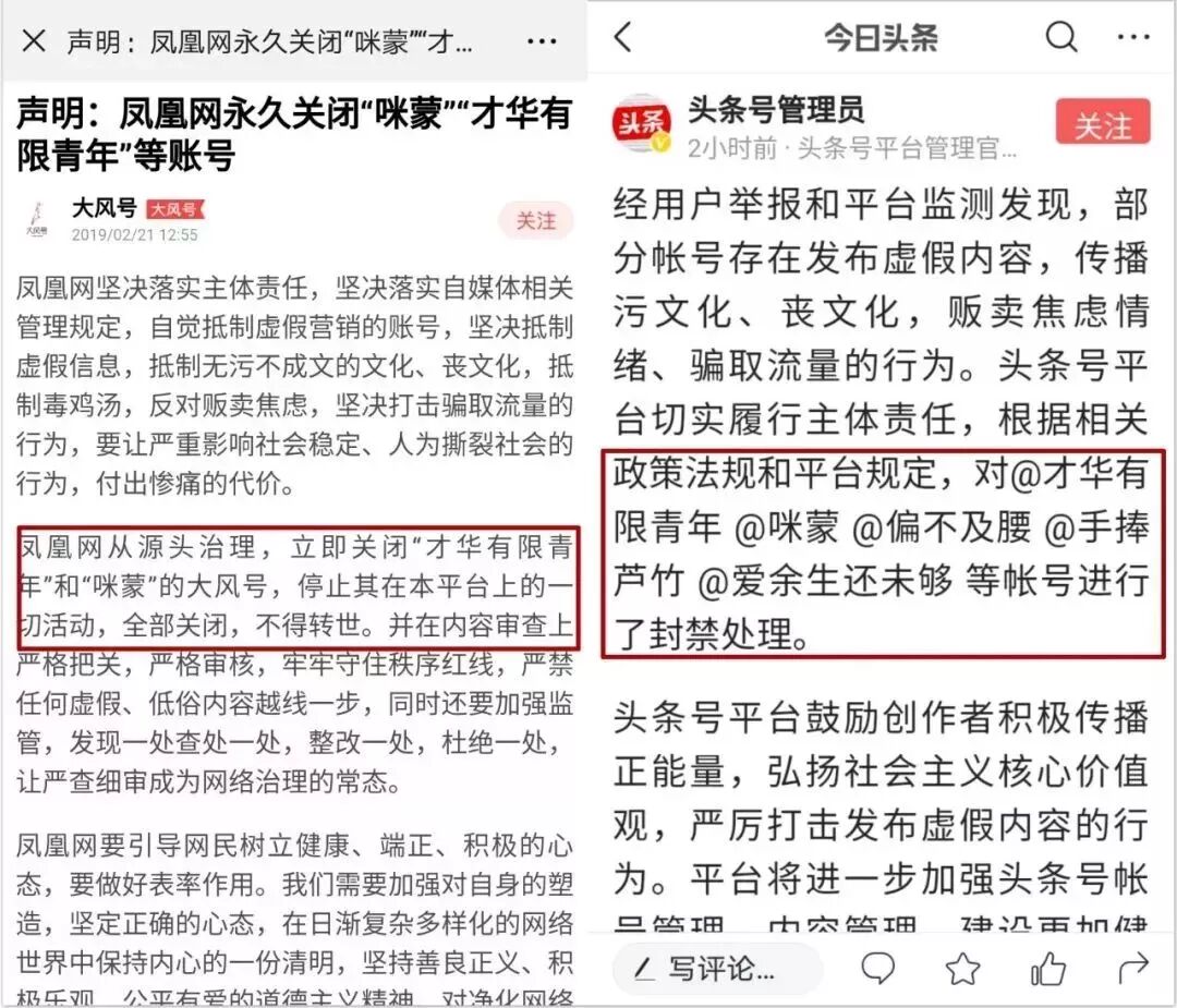 咪蒙公眾號(hào)注銷的同時(shí),其他新媒體平臺(tái)也紛紛宣布封禁咪蒙、才華有限青年等賬號(hào),并且是全面封鎖,轉(zhuǎn)生也不行。