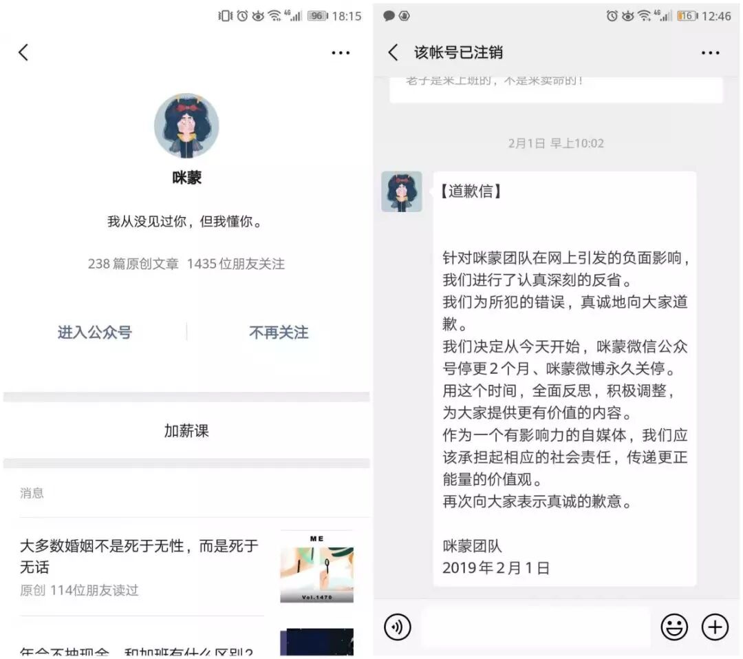 由于公眾情緒激昂,咪蒙于2月1日發(fā)文致歉,宣布關(guān)停咪蒙微博,并停更公眾號(hào)2個(gè)月。然后時(shí)間到了2月21,俗話說(shuō)躲得過(guò)初一,躲不過(guò)十五,剛過(guò)完元宵節(jié),咪蒙就注銷了公眾號(hào),并且旗下才華有限青年公眾號(hào)也已注銷,其小號(hào)好疼的咪蒙也已改名。