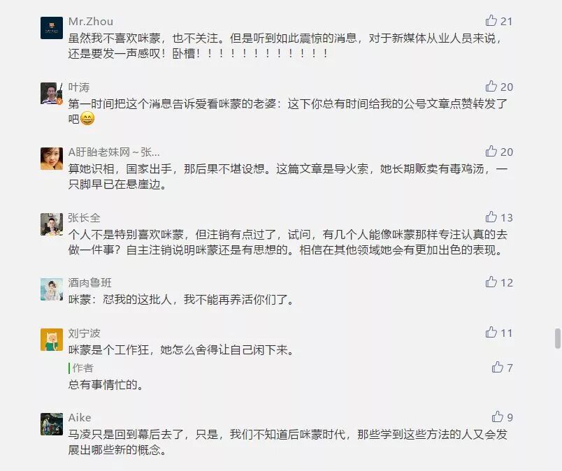 胖友們,突發(fā)消息:2月21日宇宙第一網(wǎng)紅、公眾號(hào)女王,公眾號(hào)【咪蒙】,注銷了!此前,據(jù)2017年咪蒙接受采訪時(shí)表示,公眾號(hào)為她帶來(lái)了8位數(shù)的年收入,850萬(wàn)粉絲(2018年達(dá)到1400萬(wàn)),日活300萬(wàn)的讀者。