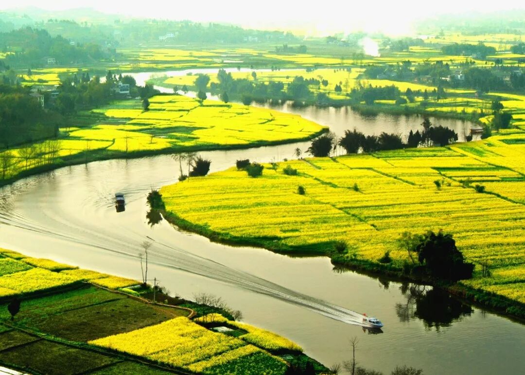 瓊江穿花海而過(guò),乘游船坐覽花海,享受春風(fēng)拂面;蹬上陳摶山,還可觀賞到以油菜為主要背景、小麥為配景形成的"太極"圖案,美不勝收。