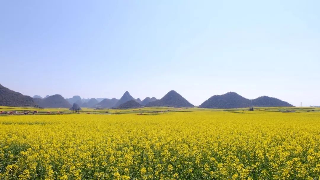 羅平油菜花海里,村落點(diǎn)點(diǎn),寨子棋布;此起彼伏的喀斯特錐形山,點(diǎn)綴羅平油菜花海中,猶如人間仙景,構(gòu)成絕妙的圖畫(huà)。