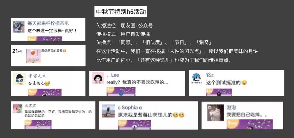 而活動(dòng)中,則是用心理測(cè)試的文案結(jié)果來(lái)為我們做引導(dǎo)。15種完全不同的月餅餡兒結(jié)果,代表的 15 種性格,就是傳播話術(shù)本身。