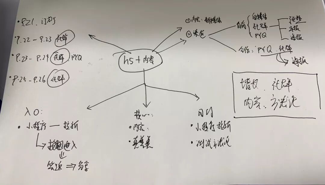 第三個(gè)分叉是活動(dòng)路徑和注意事項(xiàng)。一共三個(gè)點(diǎn),從左到右是:入口、核心、目的。其實(shí)我們要從右邊看起來(lái)。但是為什么我是從左往右寫的呢……因?yàn)楫?dāng)時(shí)開(kāi)會(huì)的時(shí)候做總結(jié),為了留出足夠多的筆書空間,就從右邊開(kāi)始寫了。(就是為了在右邊留出那個(gè)關(guān)鍵詞提煉)