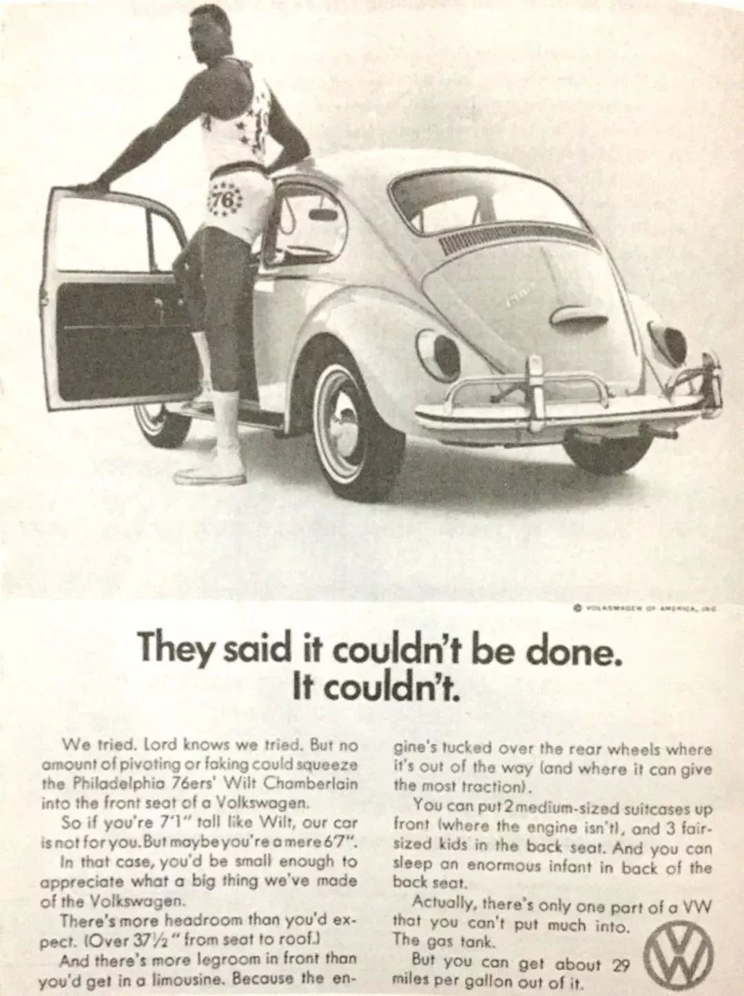 下面這一個(gè)大眾汽車經(jīng)典廣告,就是在畫(huà)面和文案上都形成了鮮明反差,2.16米的籃球皇帝張伯倫和一個(gè)看起來(lái)比較小的汽車形成了鮮明視覺(jué)沖突。
