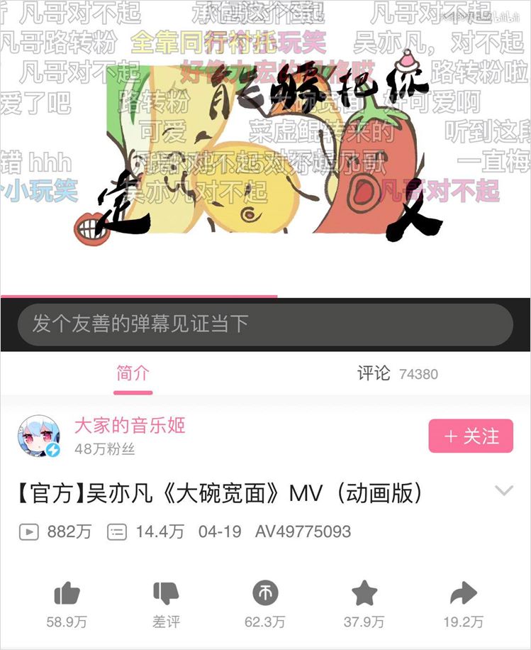 于是,吳亦凡瞬間收獲了許多路人的好感,《大碗寬面》在 B 站播放量超過(guò) 890 萬(wàn),彈幕接近 3 萬(wàn),清一色都是好評(píng)。