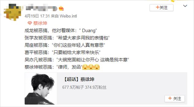 也就是說(shuō),現(xiàn)實(shí)中的“完美偶像”蔡徐坤,在輿論里其實(shí)是處于弱勢(shì)的。因此,當(dāng)蔡徐坤在潘長(zhǎng)江微博評(píng)論區(qū) diss 網(wǎng)友的時(shí)候,大家會(huì)罵他情商低;當(dāng)蔡徐坤因?yàn)楸粣焊愣l(fā)律師函的時(shí)候,大家會(huì)覺(jué)得他玩不起。