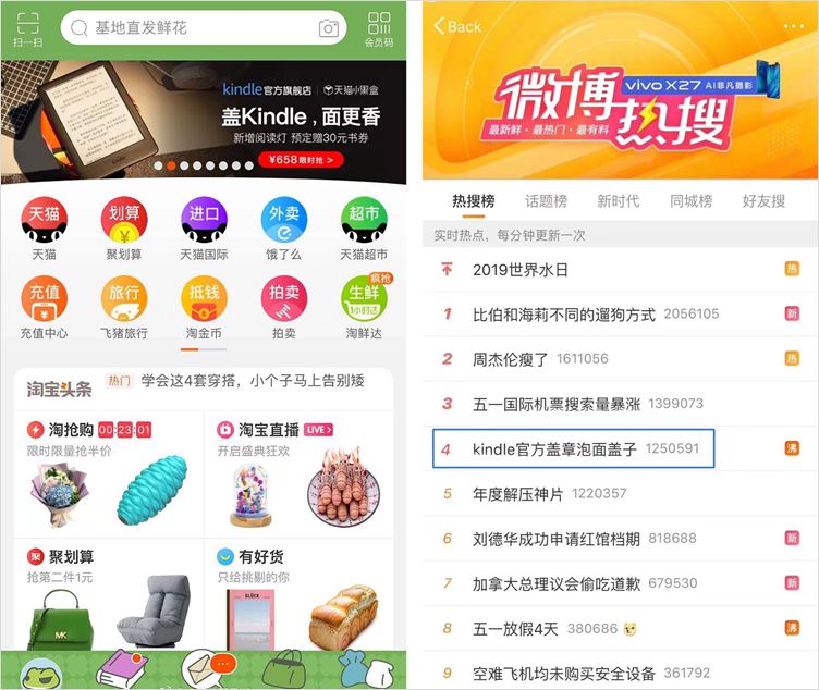 比如,最近 Kindle 官方蓋章了泡面蓋子,登上了微博熱搜榜。除此之外,Kindle 還聯(lián)合聚劃算推出了泡面禮盒,開(kāi)售 2 分鐘就賣(mài)出 100 臺(tái),相關(guān)話(huà)題閱讀數(shù)已達(dá)千萬(wàn)。