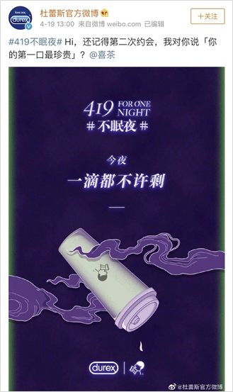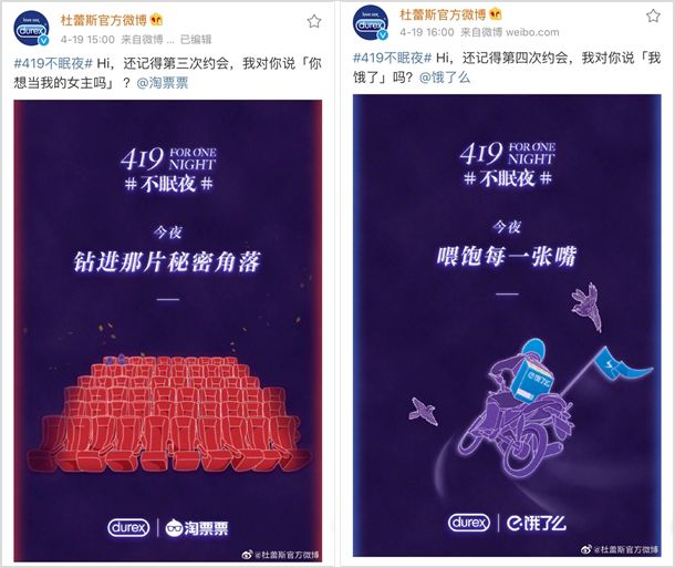 4 月 19 日(419 諧音 for one night 一夜情),杜蕾斯跟餓了么、喜茶、淘票票等諸多品牌,在這一天進(jìn)行了跨界營(yíng)銷(xiāo)。