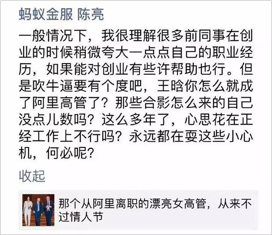 王晗賣面膜的文章:《那個(gè)從阿里離職的漂亮女高管,從來(lái)不過(guò)情人節(jié)》,引發(fā)螞蟻金服集團(tuán)副總裁陳亮對(duì)其阿里“女高管”這一虛假身份的揭露,網(wǎng)友們對(duì)這篇賣貨文章也多為嘲諷意味。