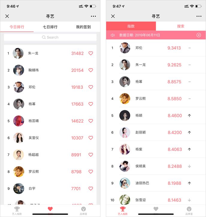 左尋藝公眾號(hào)簽到,右尋藝指數(shù)