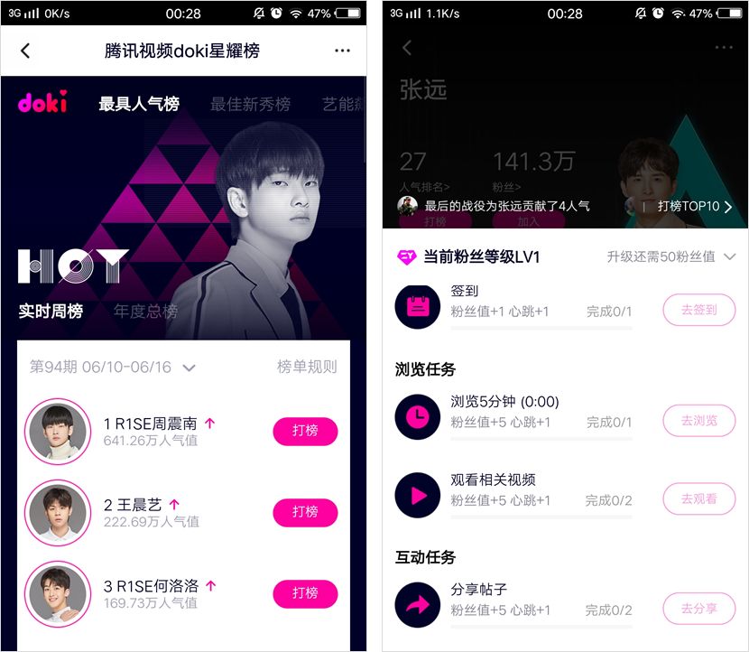 除了微博之外,騰訊也有類似的騷操作。比如嵌在騰訊視頻內(nèi)部的 doki 社區(qū),這里面的明星排名,都是通過(guò)粉絲們每天簽到、瀏覽相關(guān)頁(yè)面、看相關(guān)視頻等來(lái)提升。
