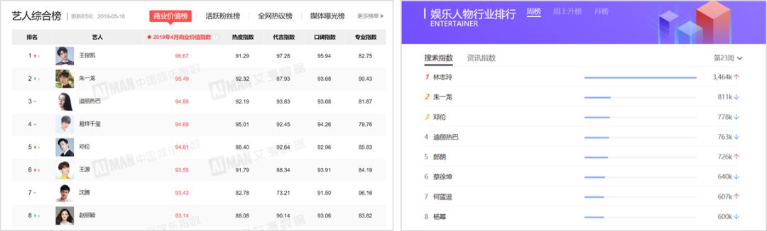 號(hào)稱權(quán)威商業(yè)價(jià)值榜的艾漫數(shù)據(jù),百度指數(shù)專門的娛樂(lè)人物排行等,上面的明星光鮮排名的背后也都離不開(kāi)粉絲們的努力。