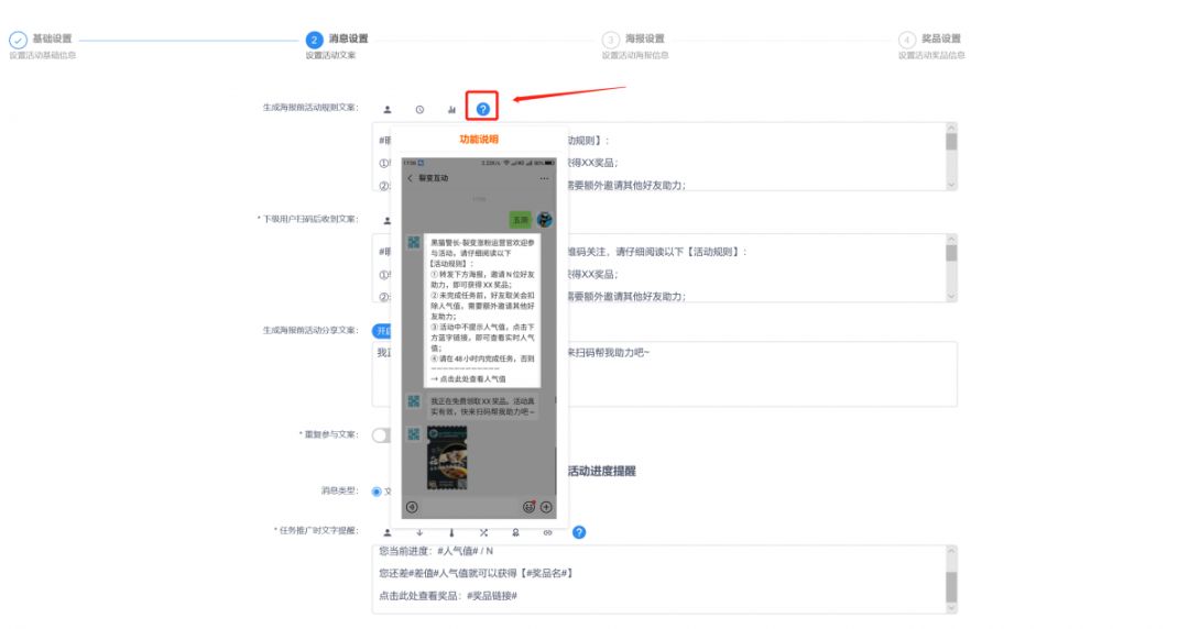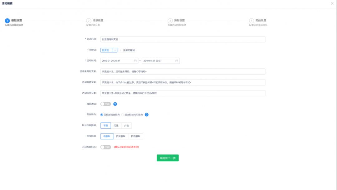 運(yùn)營(yíng)指南裂變寶采用一鍵式操作流程,“四步走”設(shè)置,從第一步“基礎(chǔ)設(shè)置”到最后一步“獎(jiǎng)品設(shè)置”,完美解決了這一痛點(diǎn)。