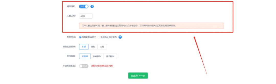 比如設(shè)置4000,當(dāng)粉絲增漲到4000時(shí),就在微信端提示運(yùn)營(yíng)者到達(dá)警戒值,以便于運(yùn)營(yíng)者及時(shí)停止活動(dòng),以避免不必要的損失。